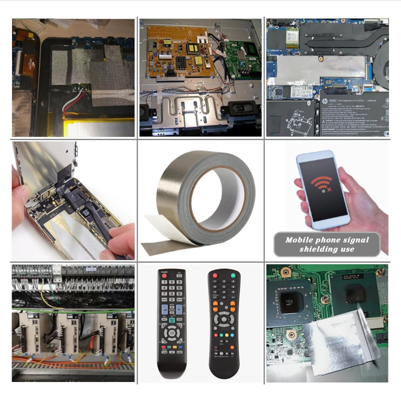 Conductive fabric tape is widely used in the assembly and protection of electronic devices where reliable conductivity, grounding, and EMI shielding are required. It can be applied to wrap cables, bond EMI gaskets, reinforce connector interfaces, or line housings to prevent electromagnetic leakage. The tape’s conductive adhesive ensures stable electrical connection between components, making it suitable for complex assemblies where flexibility and repeated bending are necessary. In addition, it is often used in anti-static (ESD) protection, shielding of display equipment such as LCDs and PDP panels, and in specialized environments including shielding rooms or protective clothing for high-radiation work. By combining strong adhesion with excellent conductivity, it provides both mechanical fixation and electrical performance, ensuring stable operation of sensitive electronic systems.